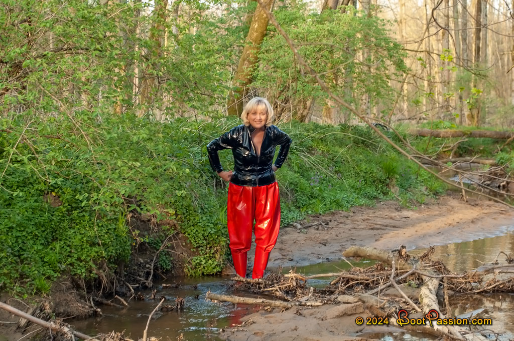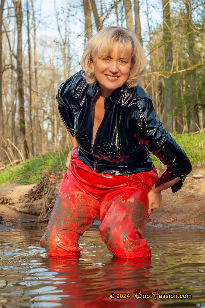 What fits better in this environment than my beloved red latex trousers with the perfectly matching Boden Wellies? I really enjoyed them and explored the shallow bank with squishy sandy mud. Soon I sat down in the soft mud — my latex outfit was the best protection for this.