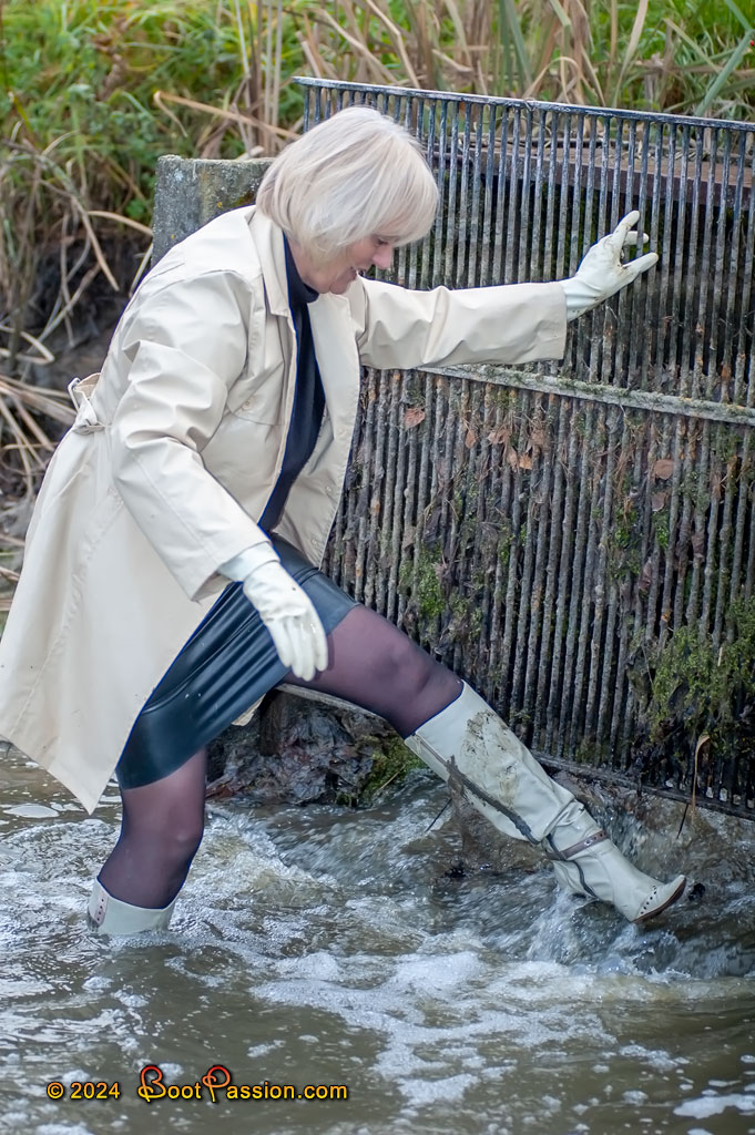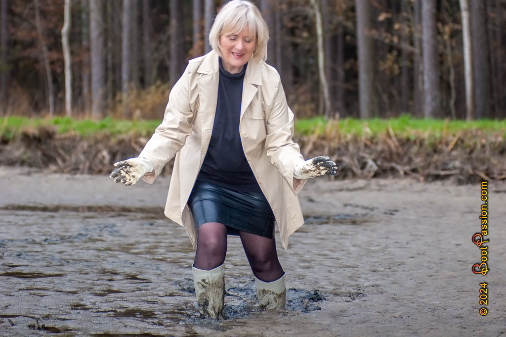 Gallery 1012 (Oct 23, 2024). At the time of this gallery, the weather was quite uncomfortable and it was even a bit cold. So I kept warm with a sweater and coat. Rubber gloves and latex skirt helped against mud splashes and finally my knee-high heel boots for a proper march through water and mud.