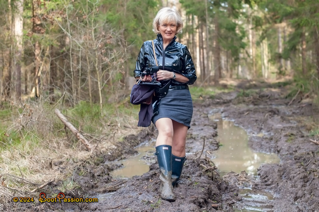 Gallery 1018 (Dec 4, 2024). Out in the woods with a vinyl coat, Hunter Wellies and binoculars. It was going to be a lovely walk with lots to discover. The best thing was the Wellies, which allowed me to wade through puddles and mud without worrying. And yes, after a long period of rain there were lots of wet and boggy places and plenty of mud, mainly on the forest paths. This was probably because heavy harvesting machinery had churned up the ground and the rain had then turned it into deep muddy furrows. Really a marvellous forest walk, so that I almost forgot the time. In the end, we even had to sprint through the mud puddles so as not to miss our next appointment. Enjoy!