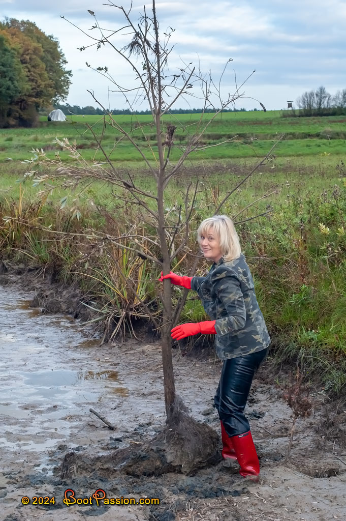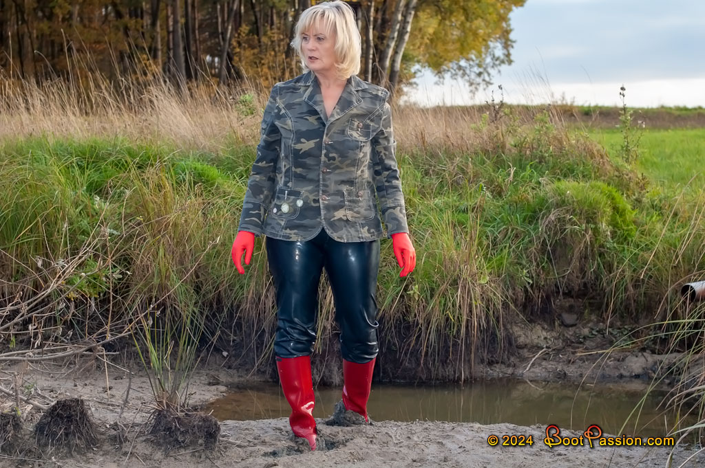 Gallery 1020 (Dec 18, 2024). Fine weather in autumn and an equally fine pond with tidal mud (and an uprooted tree). I wore my shiny red Marc Jacobs heeled boots, latex trousers, my camouflage jacket and matching red rubber gloves. So I was perfectly equipped for a dirty action. Right at the start, I had the idea that I could replant the little tree that was lying halfway in the soft mud. Oh boys, I had totally misjudged the work. The root ball was completely soaked with mud and far too heavy for me to even move it. I tried to straighten it up anyway, which was halfway successful. Meanwhile, of course, I sank deeper and deeper into the mud with my boots. Eventually they even sank into the mud up to the top of the boots... what I had hoped for, honestly.