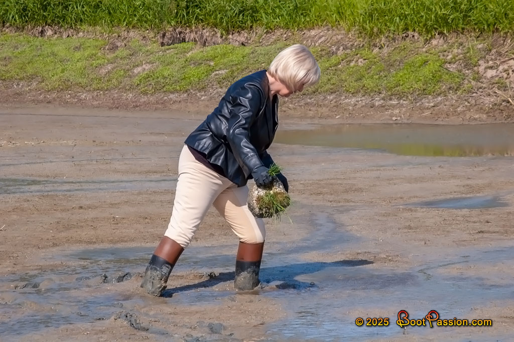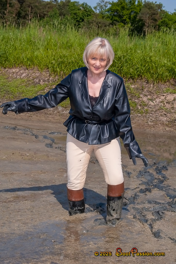 Gallery 1030 (Feb 26, 2025). Here I am wearing a pair of very special rubber riding boots. Real vintage treasures, made by Romika, with brown leather cuffs. I thought they went best with breeches and a leather jacket, what do you think? But the boots don't just look good, they are also very high, so they really protect you even when walking through a tidal pool with deep sludge like here. Take a look at the pictures and you'll know what I'm talking about. Have fun!