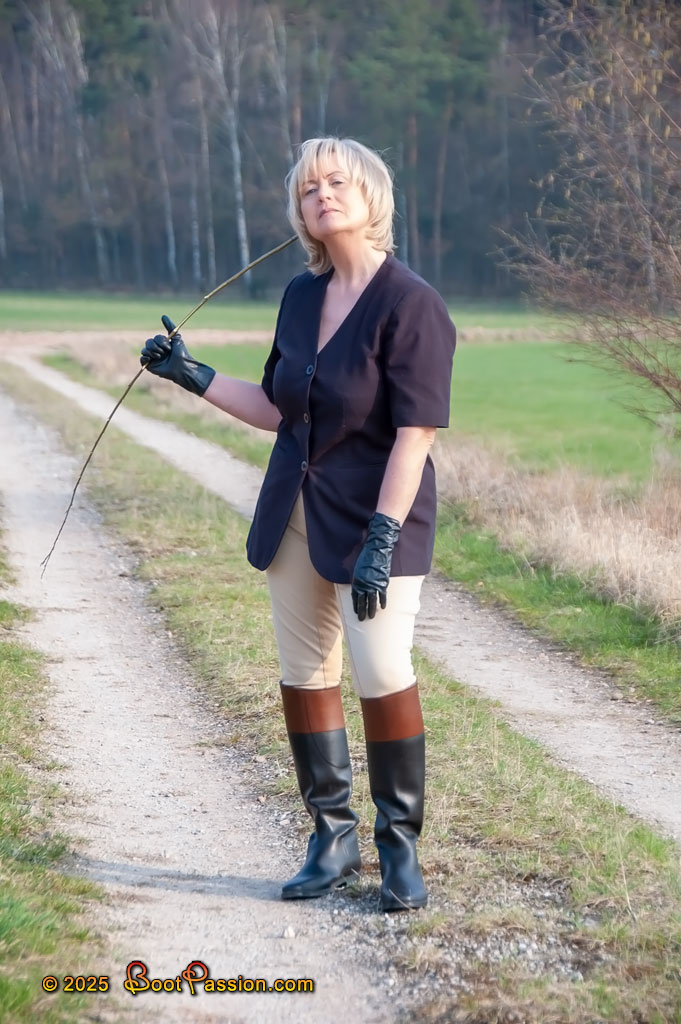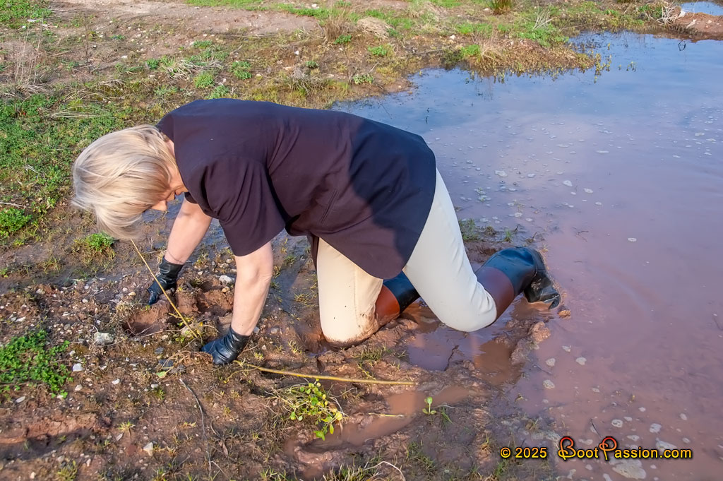 Gallery 1052 (Jul 30, 2025). Reddish-brown mud is not so rare in our region. And yet it is something special, like here on this building site. And this time the color even goes perfectly with my black-brown Romika Turf riding boots and my beige breeches. We were in a great mood and happily enjoyed the pools of water and mud. Then came the moment when the boots unexpectedly got stuck and I lost my balance. I had to laugh spontaneously. But my breeches were now muddy brown from top to bottom. I didn't care, because they had to be washed anyway.