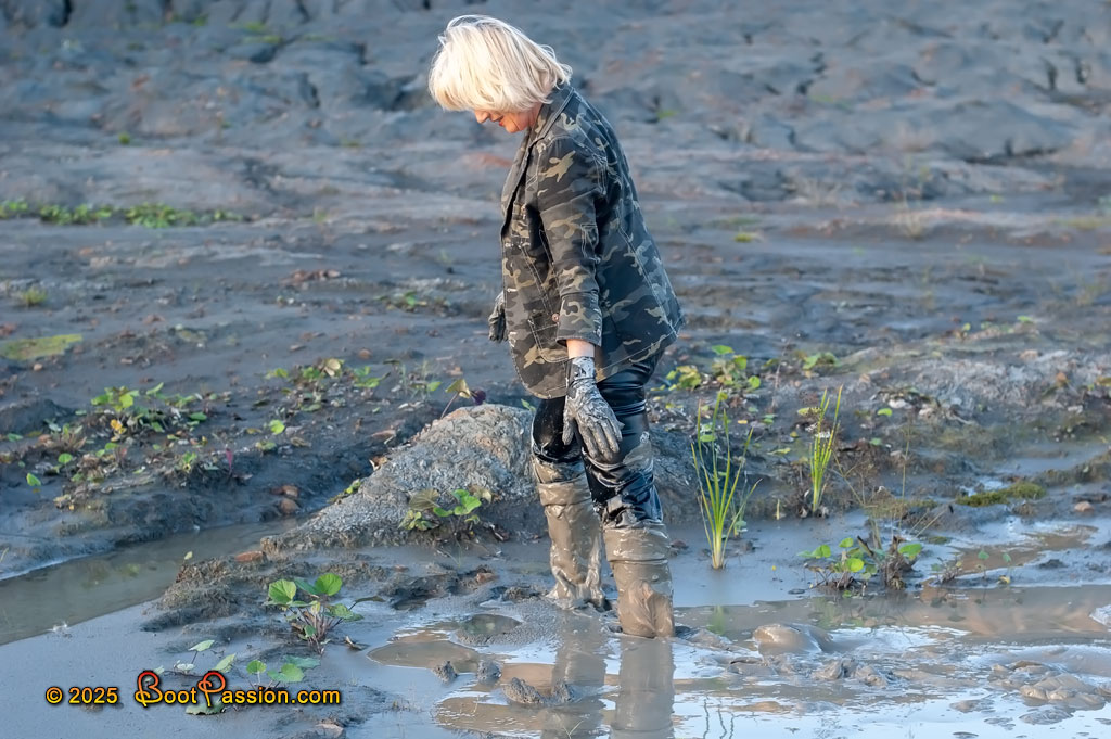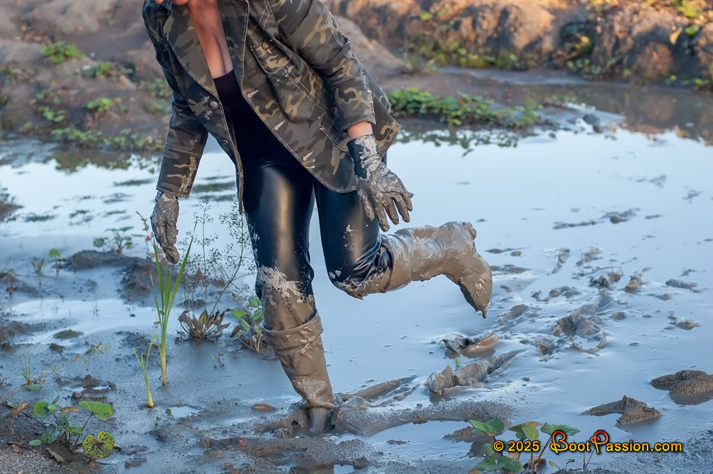 No sooner had I realized this than I was already stuck in the sticky clay. It took a lot of effort to escape from this mud trap. Afterwards, not only were the boots completely covered in mud, as you can see, but also my latex pants. Enjoy watching.