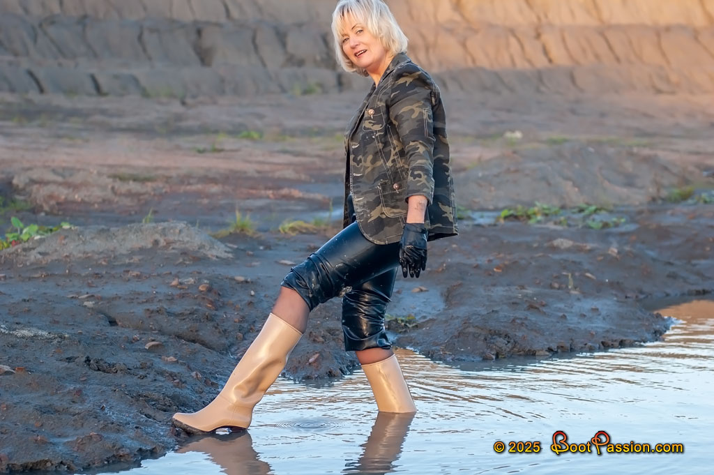 Gallery 1053 (Aug 6, 2025). These beige Rontani rubber boots with high heels are our treasures. They are tall and have a beautiful style that you don't find nowadays. Unfortunately, they don't show up well in this gallery because, to our delight but completely unexpectedly, they sank up to the tops in the deep mud.