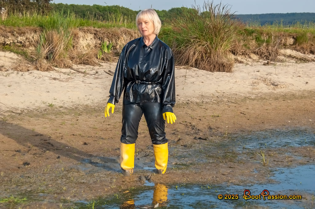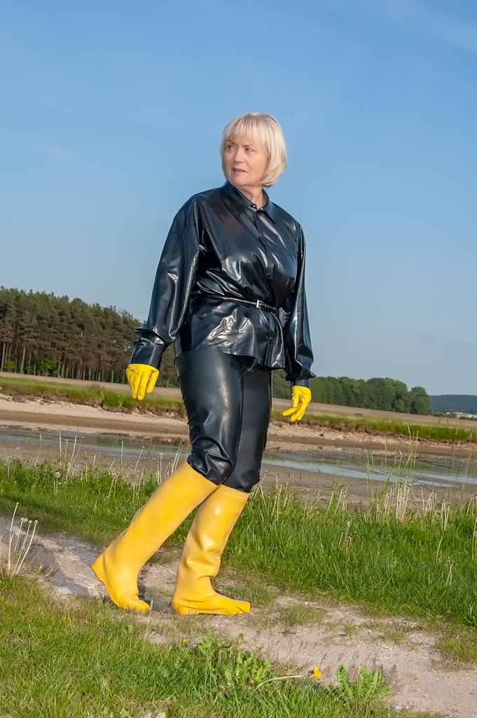 Gallery 1068 (Nov 19, 2025). Completely dressed in latex and fully protected from mud and dirt. And the best of all: these yellow Zivalco boots are also made of soft rubber, exceptionally high and unlined. It feels like wading through the mud barefoot.