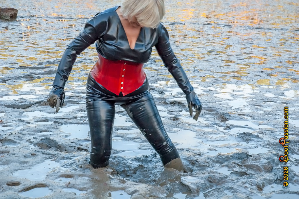 As you can see, I was wearing a full latex outfit, complete with a red corsage, and my high rubber riding boots. These boots are perfect for such conditions as they are slim and don't get stuck in the mud too easily.