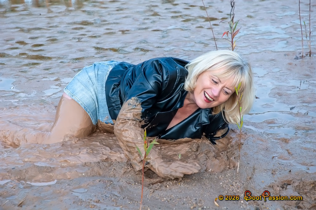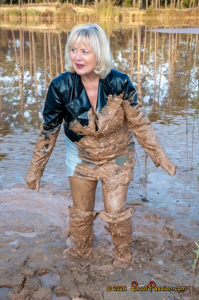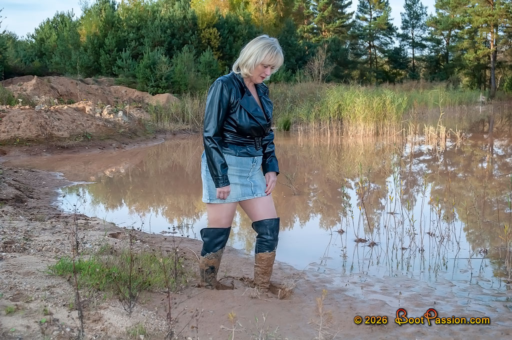 Gallery 1089 (Apr 15, 2026). Overknees with a miniskirt and treacherous spots in an promising clay pit. Yes, we've been here a few times before. And every time we discover new puddles of soft and sometimes even sticky clay.