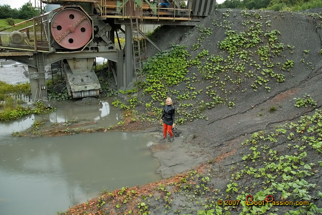 Gallery 110 (Jul 4, 2007). Today we visited a deserted industrial site with gigantic machinery which was probably used, sometime, for the open-cast mining. Those in the background seems to have been a conveyor. Meanwhile rust dominates and erosion from surrounding clay hills formed muddy ponds. A beautiful spot even if the puddles seem to be malicious here and there. There is so much more to explore. Really! Since it rained all the time however and I already was wet like a cat, we left it open for next excursions.