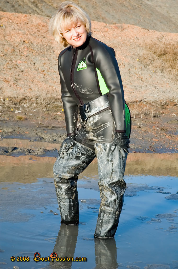 Gallery 143 (Feb 20, 2008). Presumably it will last a while before the weather is getting warmer again. So what can we do during the cold season without having to forgo our passion? We bought a neoprene suit! Our beautiful little moon lake had an ice layer again but that was no problem today. We have even enjoyed a delicious mud bath on the shore. After a while we heard voices. Indeed, there were a couple of young spectators nearby. They seemed amazed about our activities but after some minutes of watching they made first, hesitant steps into the mud... and obviously had a lot of fun.