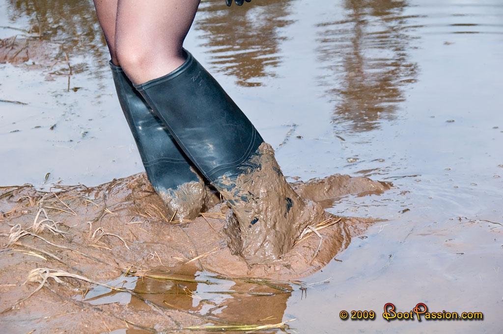 Gallery 242 (Jan 13, 2010). Fashionable black blazer, unobtrusive miniskirt — almost a tasteful business dress so far. But hey, why on earth would you wear those chunky Zivalco boots? Quite simply... I thought it was time to remind you that I like contrasts. It was by the way a good decision. Accidentally we discovered an interesting place, a drained pond with "bridge over muddy waters", which looked more than inviting. Somehow different but a perfect adventure playground for muddy games... (44 pictures and 6:12 min video in the members area).