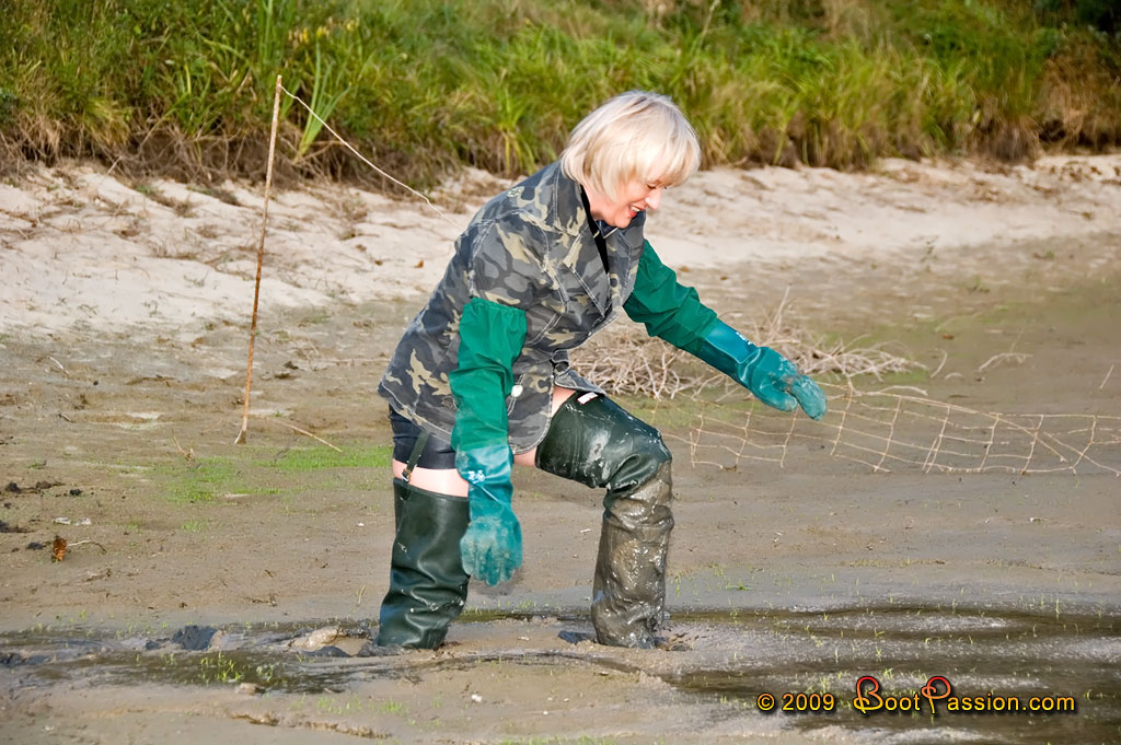 Gallery 251 (Mar 17, 2010). Hunter streamfisher waders are always a good choice, aren't they? They are tall enough to protect the legs up to the thighs so that I dared to combine them with my ultra mini latex skirt. The session seemed to become very muddy at first glance and it turned out soon that my guess was even an underestimation. Well, how could it be different? Sometime the mud went over my waders' tops. Decently getting out of the muddy brew was a hard job. But the gloves were really very helpful, simply great... thanks again, Peter! (44 pictures and 6:13 min video in the members area).
