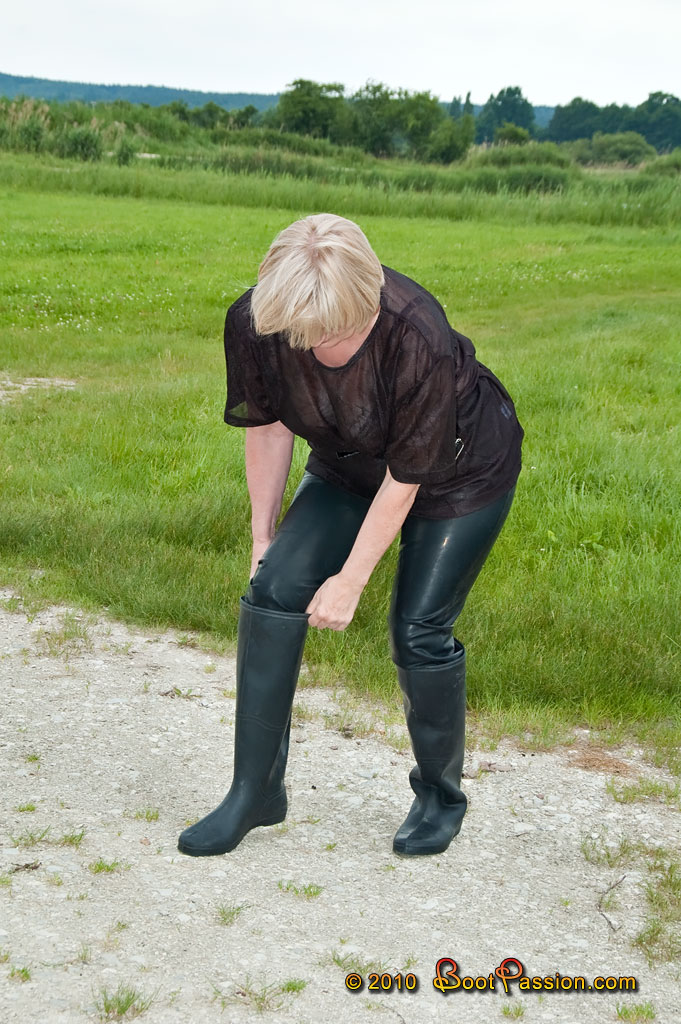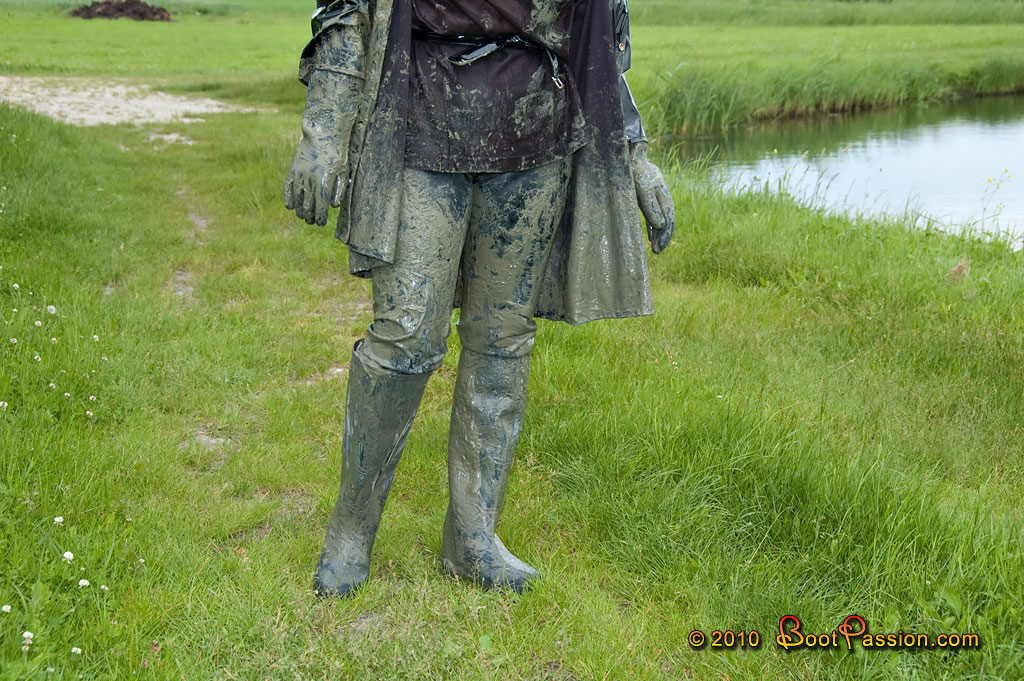 Gallery 263 (Jun 9, 2010). Latex trousers, tucked in Zivalco rubber boots. A pair of tough rubber gloves and a shiny PVC coat against rain and wind... That's the way I like it! Protected and well prepared in the face of a new muddy adventure. We stumbled upon an old bucket by chance and so I started to pick some water lilies from the swampy ground. However, the bucket at the hand together with the deep sucking ground reduced my mobility. No wonder that I instantly lost balance when suddenly one of my legs got stuck. No way, I fell backwards into the mud. You can imagine the result — or simply enjoy the pictures above.