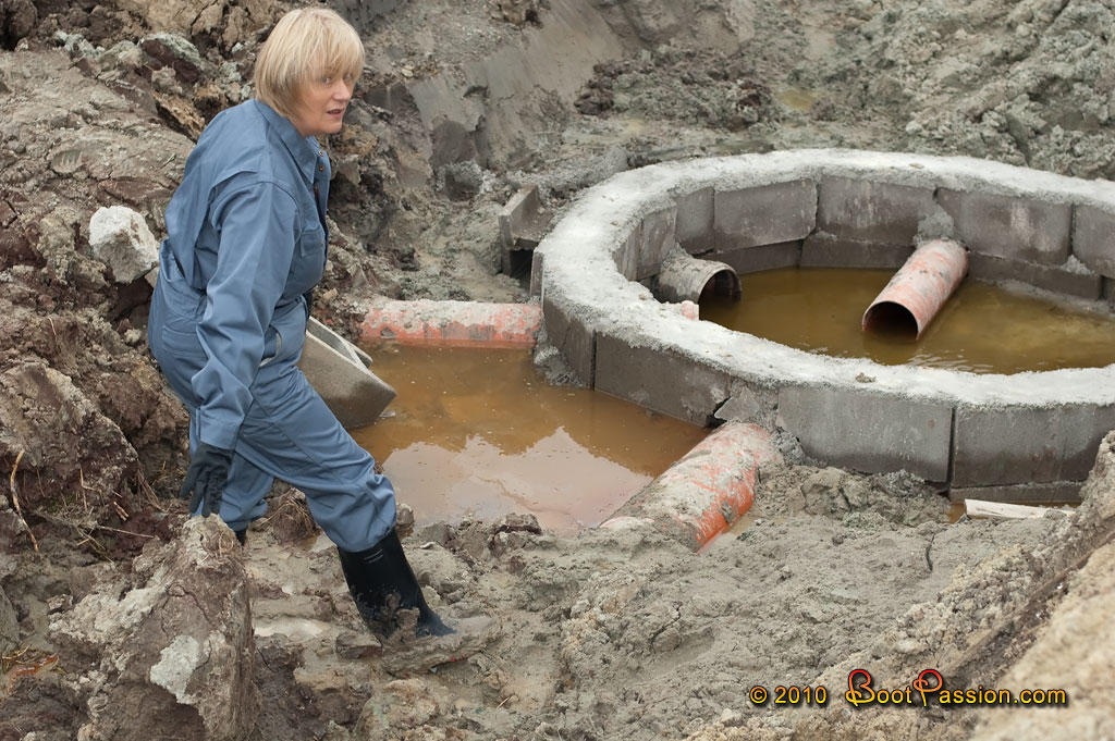 With coverall and tough worker wellies (you know, those with red sole). Um... which kind of construction could it be, what shall be built here? Really strange, so many pipes and a circular basin. I suspect a kind of buried sewage system or something like that. Obviously it will be filled up sometime but, at the moment, it is simply a great adventure playground for our "hobby". Huge mounds of earth, water places, muddy ditches... We have fortunately seized our opportunity in time (and extensively).