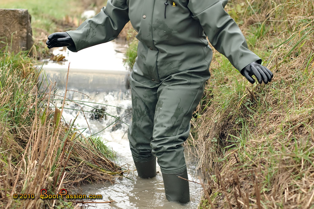 Gallery 301 (Mar 2, 2011). It was quite cold and unpleasant already at the time of this gallery. Late autumn. Fortunately it happened that a fellow boot-lover had just provided me with this full-body pvc suit, or better "waders suit", because the boots are integral part of the suit. Wrapped in that waterproof gear we decided to do a ditch tour. I splashed through the ditches, fighting against the water floods, immersed to the hips, oh what a marvelous experience! (54 pictures and 6:17 min video in the members area).