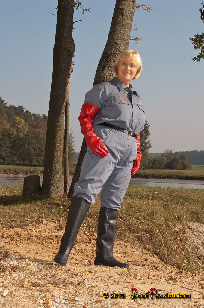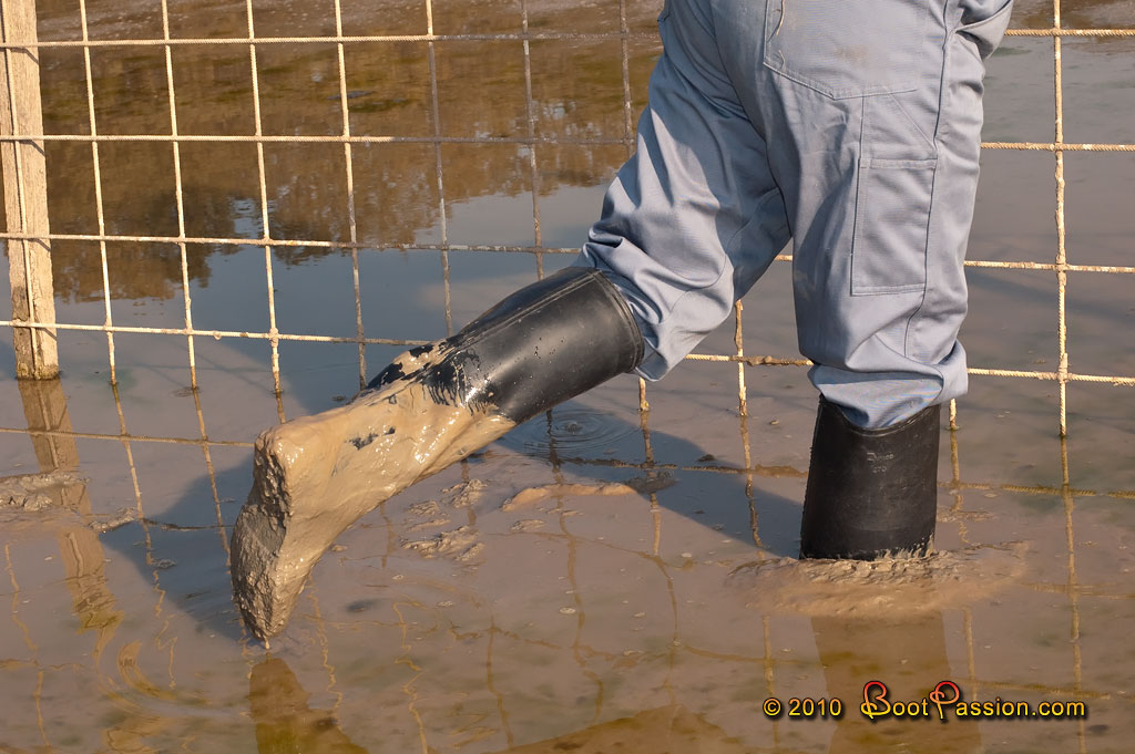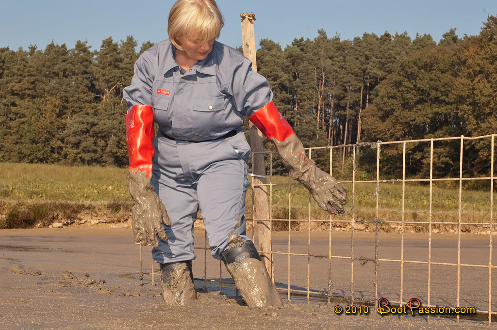 Gallery 308 (Apr 20, 2011). I come dressed in firm working clothes today: Coverall, Zivalco boots, shoulder-length work gloves. The latter were a present of a good friend. Thanks, L., these gloves are really tough and highly mud-proof because of their length. Hot... and sorely needed today! Why? Because we came across a ripped fence in the middle of a deep, sloppy mud pond which I had to repair. Above and below the muddy surface, of course... I think I should demand a "dirty work bonus" sometime.