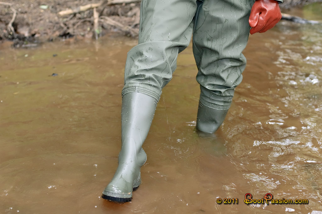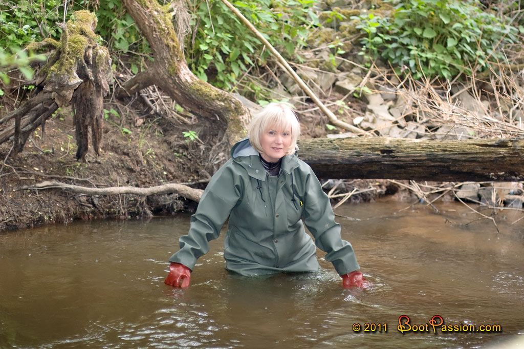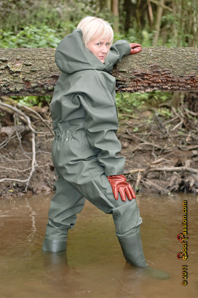 Gallery 324 (Aug 10, 2011). Some call it "wading suit", "mud suit", or "full body wader suit" while others see it as a fun costume in which you can go anywhere. Thanks to the members of Yahoo's muddybootsandrainwear group for many acknowledgements and friendly help in finding an appropriate name for my new "full body wet suit". Which proved to be waterproof by the way (at least waist-deep). Only the cuffs weren't tight-fitting. Unfortunately I didn't notice that my gloves slowly filled with water. You can imagine what happened when I lifted my arms...
