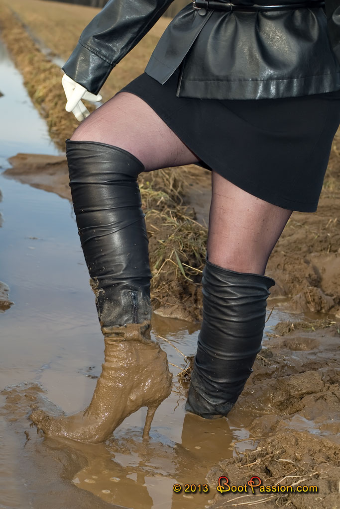 Gallery 406 (Mar 13, 2013). Our session began with an unexpected encounter: Just when I made my first steps onto the dirt road, a rider came past. She seemed slightly irritated but then continued her way. Maybe she wondered about my heeled overknees in this inappropriate environment. Quite understandable. Fortunately she could not longer pursue my walk across the muddy fields. I think she would have found it even more puzzling if she had seen me strolling through knee-deep mud — or with high heels on ice (yes, it's still winter here). Thanks to H. who has generously provided these great boots. (56 pictures and 6:13 min video in the members area).