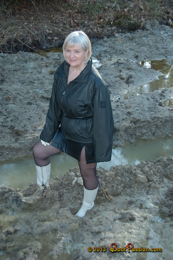 Gallery 411 (Apr 17, 2013). These fashion boots have experienced hard times over the years but part from just a few scratches they look as on the very first day. And well, I know that I'm not the only one who loves their lovely sight (clean and muddy). This time we found a wonderful cleared woodland. The area was surrounded by deposited mounds of earth. I couldn't resist to climb over the Muddy Hills — and discovered a magnificent playground with deep spots and muddy puddles. It didn't take long before I had already sunk in over the boot tops. (44 pictures and 6:13 min video in the members area).