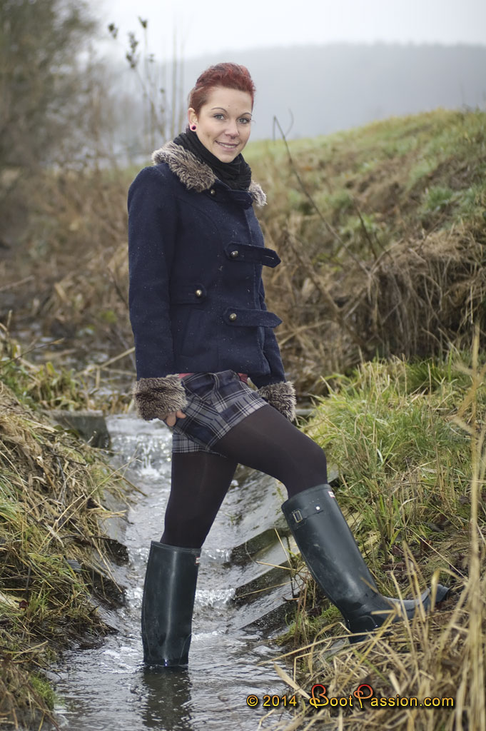 Gallery 455 (Feb 19, 2014). Emily for the first time in Hunter Wellies. She immediately put them on and went off to try them out in a creek which ran by the wayside. Without hesitation she climbed down the steep slope and also managed to hold balance while wading through the fast streaming water. All in all a rather slippery venture. But yet only the beginning of a more extensive adventure through soft, sloppy, and partially also sticky mud where she almost would have lost her wellies... (48 pictures and 6:11 min video in the members area).
