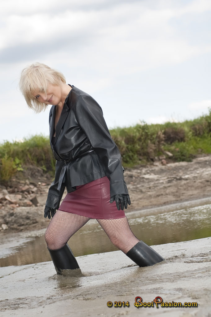 Gallery 481 (Aug 20, 2014). Mild weather on a midsummer's afternoon. It was a little stormy, though, you see it in the branches — and in my hair. But hey, that raises the spirits and makes a good mood with a feeling of lightness. Indeed, it stimulated our desire for a proper mud-walk in nice rubber boots. Riding boots in this case. And well, leather mini skirt and fishnet stockings are made for that little bit of extra excitement, aren't they? But finally, after a frolicking splash, even the stockings were stained with mud up to the thighs.
