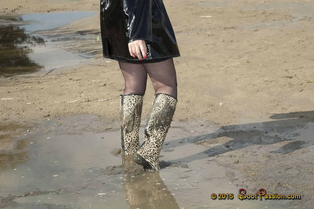 Gallery 545 (Nov 11, 2015). These leopard style wellies are a bit taller than usual for knee-high boots. That's fantastic. I would actually like to see even more boots with this height — boots that are reaching exactly up to my knees. To be honest, they were indeed required here, since the mud proved soft and smooth... and really knee-deep! (44 pictures and 6:16 min video in the members area).