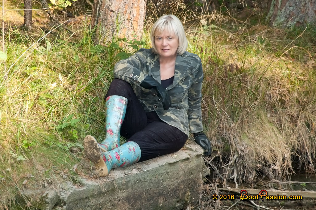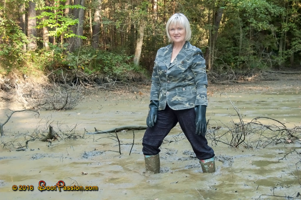 Gallery 567 (Apr 13, 2016). This time we found a nice little (drained) pond with deep tide mud in the middle of a small forest. Very promising indeed! I wore my high heeled Regina Regis rain boots. They look great with their colorful flower print even though they have a zipper on their inside. They are therefore a bit leaky but I was prepared and thanks to a pair of latex stockings under my trousers perfectly protected. Enjoy! (36 pictures and 6:16 min video in the members area).