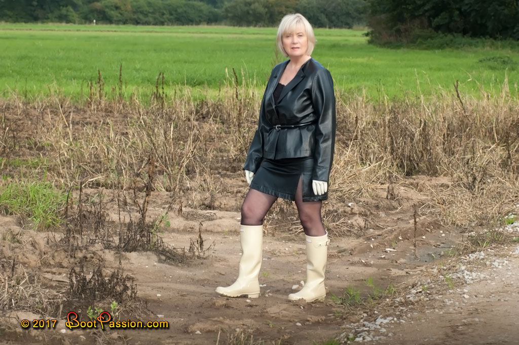 Gallery 620 (Apr 19, 2017). Hunter calls the color of these wellies "Dark Sand Gloss" — a very appropriate name for this kind of light beige tone. But what I like the most is their strong contrast between their very clean appearance and the dark brown of a very muddy ground. I like these contrasts, you know, and so I went off for a refreshing walk across that deep, water-logged area. As you have already guessed, it didn't take long for the boots to look like the surface of the field... brown and dirty. (40 pictures and 6:14 min video in the members area).