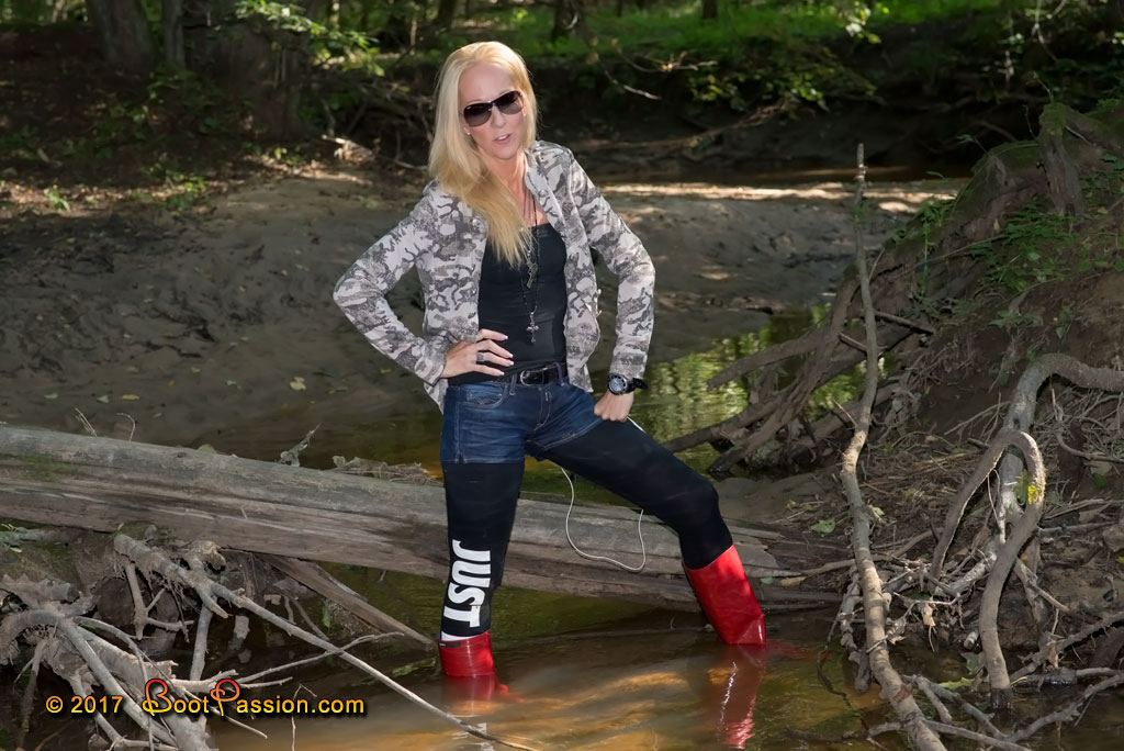 Gallery 641 (Sep 13, 2017). Kalinda continues exploring the wonderful scenic creek. The water was partially knee-deep. Thanks to her knee-high Marc Jacobs' (with heels) she could wade the water from one bank to the other without getting wet feet (except for a small mishap at the beginning). The ground on the edges became muddy here and there; particularly within a small, hidden branch of the creek where she came across a marshy spot with sloppy tide mud... Altogether a wonderful playground. Enjoy.