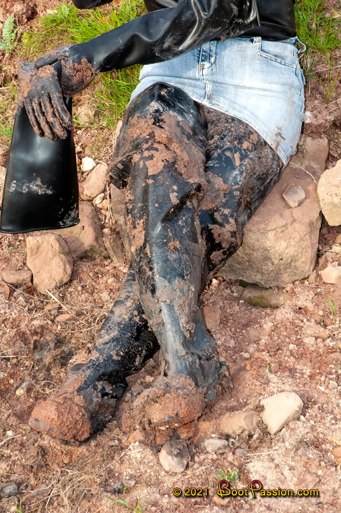 Gallery 849 (Sep 8, 2021). Exciting combination: jeans miniskirt, latex top, rubber waders and Marigold gloves.