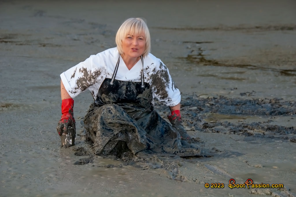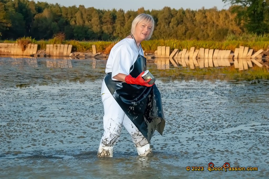 Gallery 918 (Jan 4, 2023). This was an extreme adventure: shirt, pants, Nora Wellies.... everything in bright white. And then this drained pond with wonderful black mud.... deep and soft. You certainly can't get more contrast than that. I like contrasts, as you know. By the way, there was once again a spectator, just when I was standing in the deepest mud — completely defenseless.