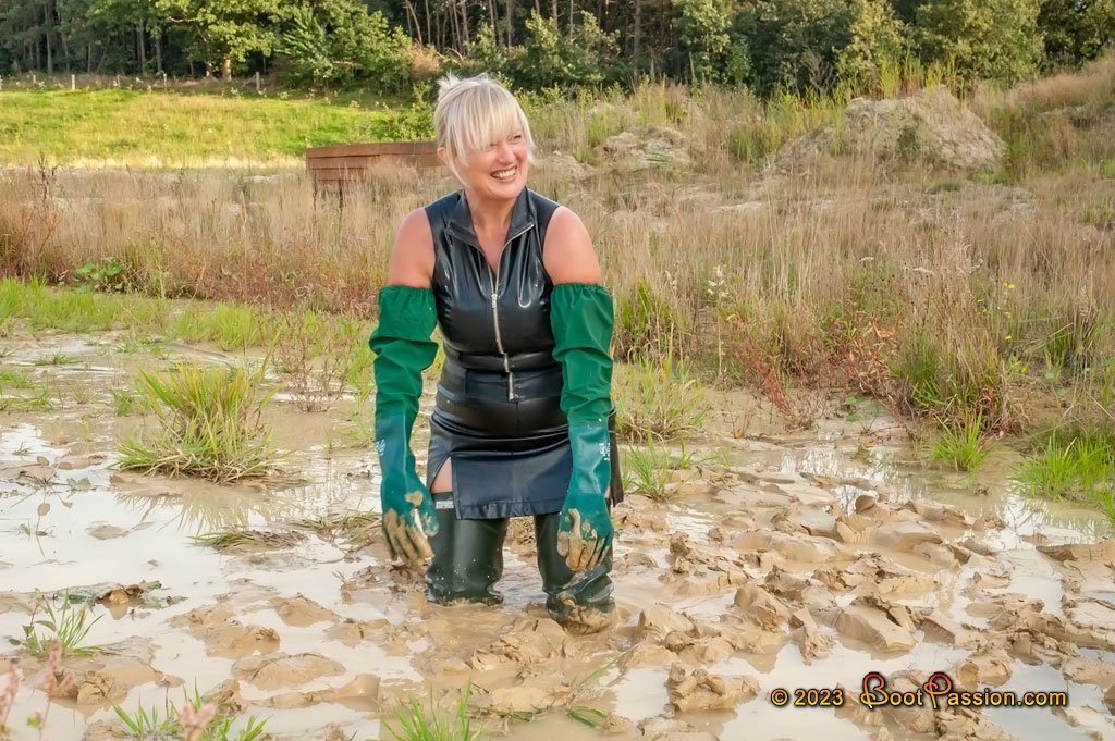 Gallery 922 (Feb 1, 2023). Yes, we came across this beautiful spot quite a while back at a meeting with some like-minded people from the Muddybootsandrainwear group. Lovely soft mud in a clay pit, as you can see. My Streamfisher waders are high, but even they weren't high enough. Very soon we were soaked from head to toe in clay mud. But so what? We frolicked around in the mud like kids... great freedom — great fun, as you know!