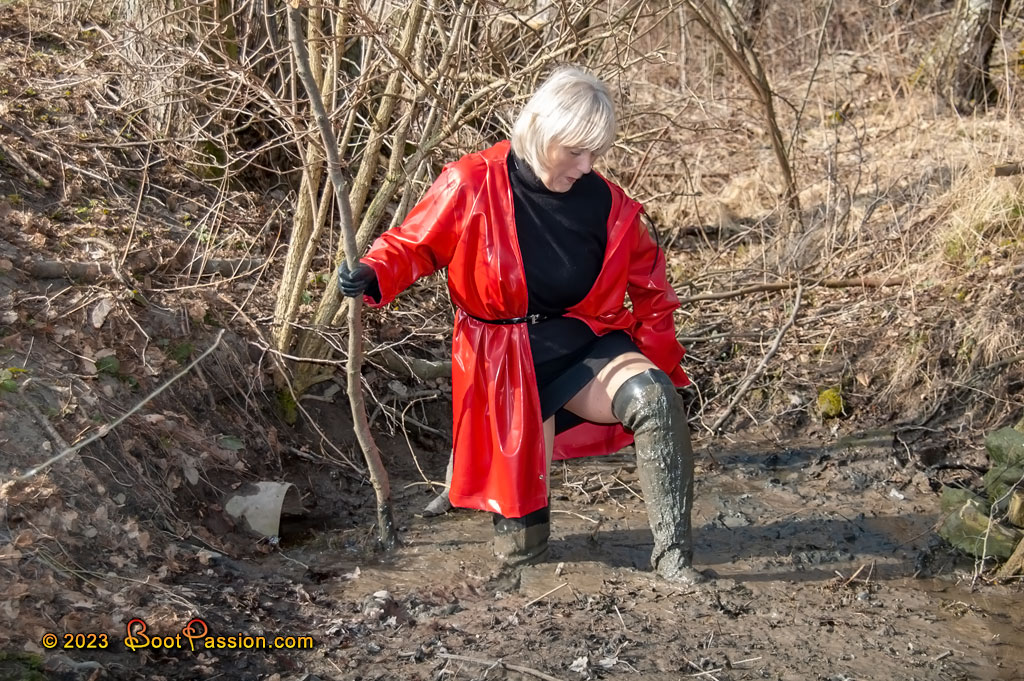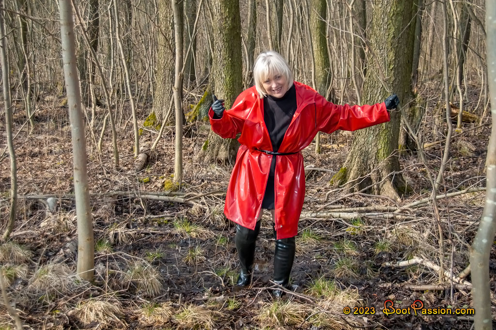 Gallery 923 (Feb 8, 2023). Dry branches and more brown than green... A grove in hibernation. My red raincoat was a nice splash of color in this dreary setting. And just in case the ground got muddy (which it did), I was well prepared with my thigh-high "Covent Garden" Acquo boots. Oh yes, it even got very boggy. At one point there was even a sinkhole with wonderfully soft and deep tidal mud. Enjoy!