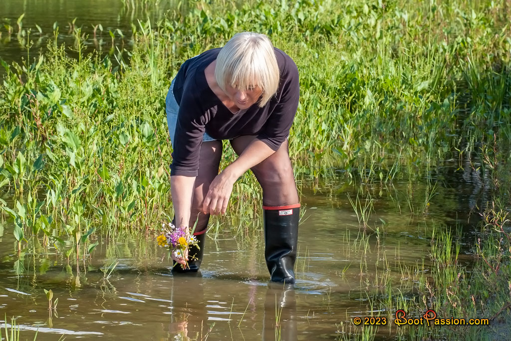 Gallery 929 (Mar 22, 2023). Mini skirt, nylon stockings and yes! Argyll Wellies! You know I love contrasts. Here we are on the road in our favorite lake area. It was a beautiful summer day, pleasantly warm and so we walked relaxed along the narrow paths between the ponds. I picked a few wild flowers and did not even notice how I got further and further into the water. Of course, this did not bother me, just on the contrary, I found it great to flood the boots. Have fun!
