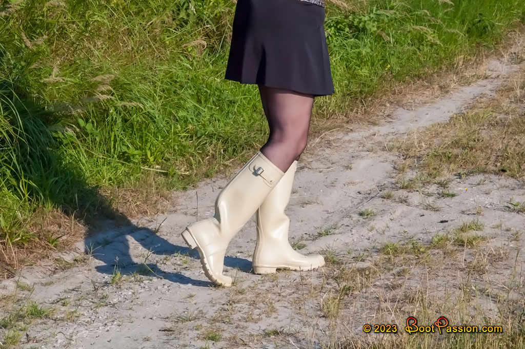 Gallery 930 (Mar 29, 2023). Shiny Hunter Wellies, not quite white, but slightly cream white, this is MY color, I love it. Hunter calls this color Dark Sand, by the way. But anyway, as always with me, the original color does not remain visible for long, and sooner or later changes to a dark mud tone.