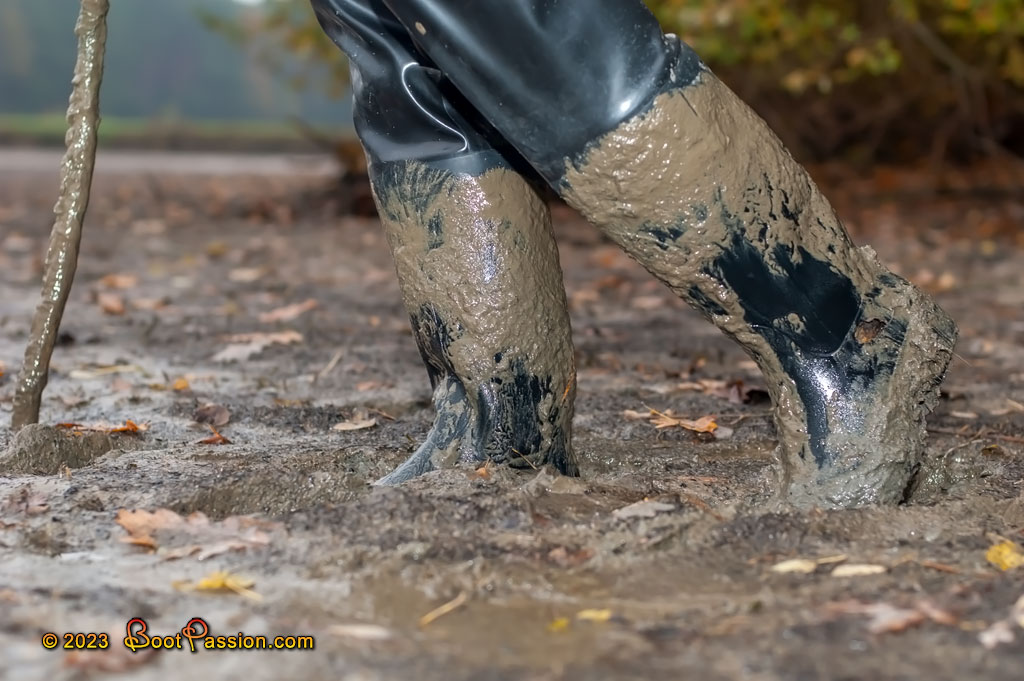 Gallery 932 (Apr 12, 2023). Chest waders, rubberized work jacket and heavy duty Marigold rubber gloves.... what more do you need for a proper action in the pond mudflats. Yes, it was exhausting, but fun to be able to wade through the mud so carefree. I did some "cleaning up" as you can see, pulled out branches and brought them to the shore. This way we even contributed a little bit to the pond maintenance and at the same time had a good reason for our action in this rubber outfit. Have fun watching.