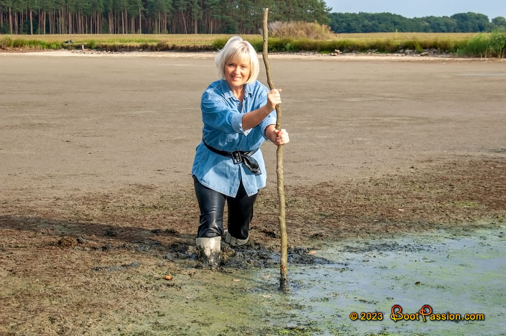 Gallery 934 (Apr 26, 2023). Rubber trousers and knee-high fashion boots with high heels gave me a good feeling of being protected from water and mud. And I was right, of course (which was no wonder, since I have enough experience with our playgrounds by now). After a hike through soft tidal mud, we came to an overgrown pond with pretty sticky ground. I almost got stuck several times. But that's part of the game, isn't it? Enjoy!