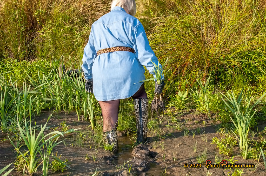 Gallery 945 (Jul 12, 2023). My denim shirt replaced not only a skirt, but even a complete dress — cool and breezy. And with this nice pair of pretty high leopard rubber boots I was well prepared for a nice mud action on a hot summer day. It is of course difficult to find suitable mud spots during such dry periods. But knowing the area and where to look, we were lucky this time too. Here, in this promising marshland, the high boots seemed especially appropriate. And yes, that was indeed a good decision, as you can see. Have fun!