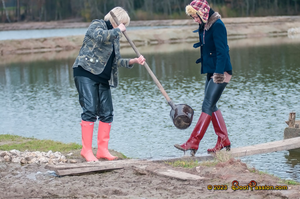 Emily was immediately quite taken with the knee-high burgundy Rontani rubber boots. I thought my shiny coral Hunters matched very nicely. And so we both booted full of sheer pleasure over the muddy yard. Have fun watching.