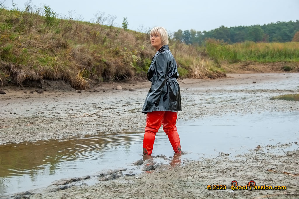 So I tried to find my way through the terrain between hills and grooves as "accident-free" as possible. Eventually I came to a drained pond with a soft bank and deep, sloppy mud in the middle. Just right for these very tall boots. Or better said, the boots were perfect for this deep ground.